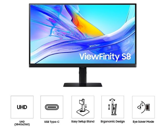 Pilihan pertama ada dari Samsung ViewFinity S8. Resolusinya mencapai 3840 x 2160 (UHD), memberikan detail yang jernih dan warna yang kaya dengan cakupan sRGB 99%.