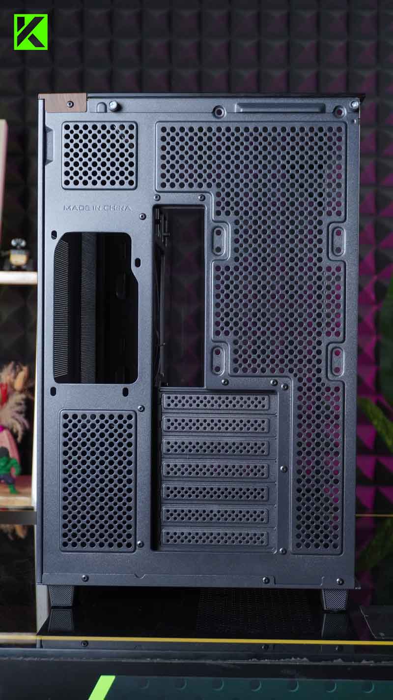 Pada bagian belakang, casing ini juga dilengkapi dengan tiga slot PCI-E yang dapat digunakan untuk memasang kartu grafis atau kartu ekspansi lainnya. Dengan konfigurasi ini, kamu memiliki banyak ruang untuk melakukan upgrade di masa depan jika diperlukan.